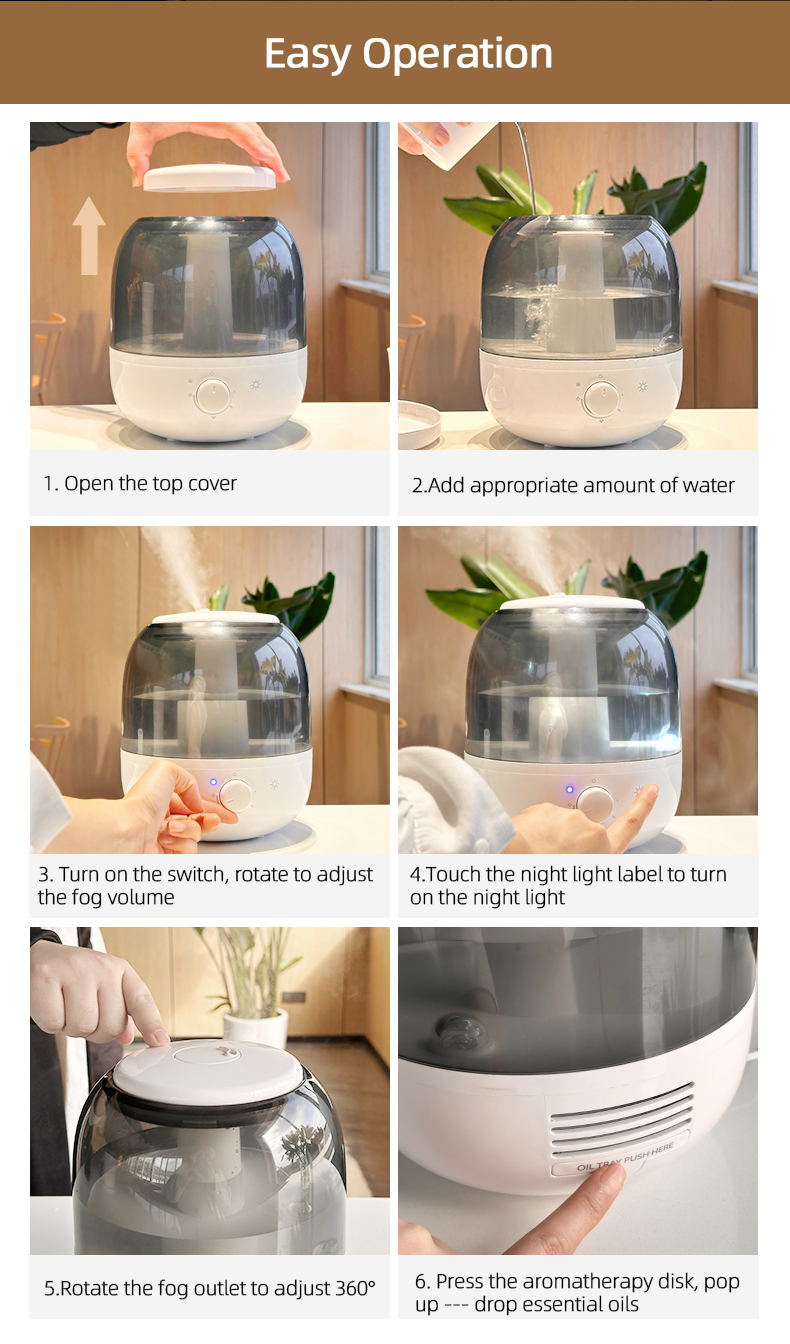 Náš nový ultrazvukový aromaterapeutický zvlhčovač s velkou kapacitou 5 l pro elektrické domácí použití činí vaše používání bezpečnější a intimnější. Je měkčí než běžné zvlhčovače a neruší vaše studium, práci ani odpočinek. Horní plnění vodní nádrže, pohodlné a rychlé, průhledná nádrž na vodu, je vidět hladina vody. Nano-jemná mlha 300 ml/h, maximální mlha může běžet 8 hodin, minimální mlha může běžet 50 hodin, může přidat aromaterapii pro uklidnění vaší nálady. Tělo zvlhčovače je vybaveno nezávislým nočním osvětlením, takže vaše noc je plná bezpečí.